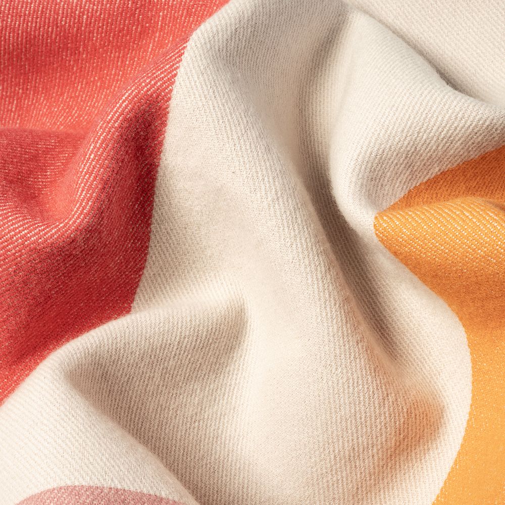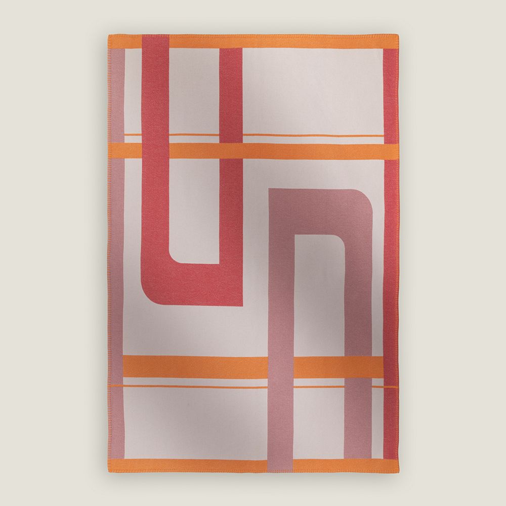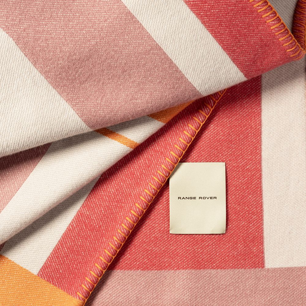 It features a distinctive abstract graphic and recurring contemporary motif inspired by modernist art and the Range Rover signature design ethos. Woven on jacquard looms and finished by hand with a contrast blanket stitch.